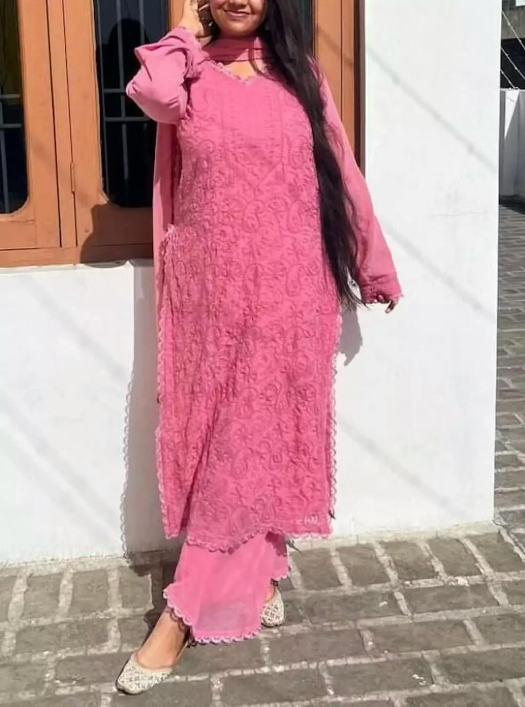 Elevate your style with this stunning faux georgette top paired with a beautifully embroidered plazo and dupatta set. Designed for elegance and comfort, this outfit features exquisite cotton thread embroidery with intricate GPO lace work for a chic and refined look.