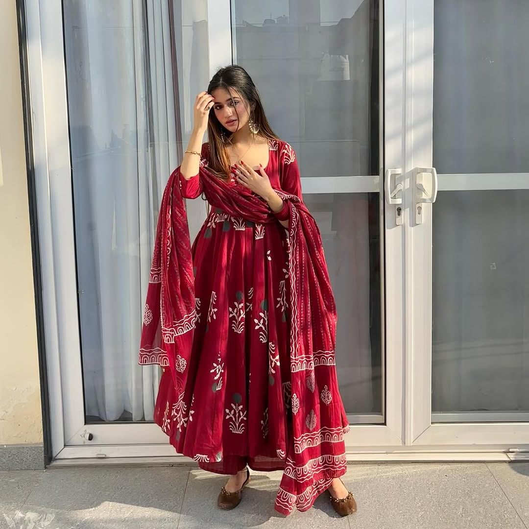 Floral Cotton Anarkali Set with Dupatta & Palazzo :3 piece suit(top,bottom&dupatta)