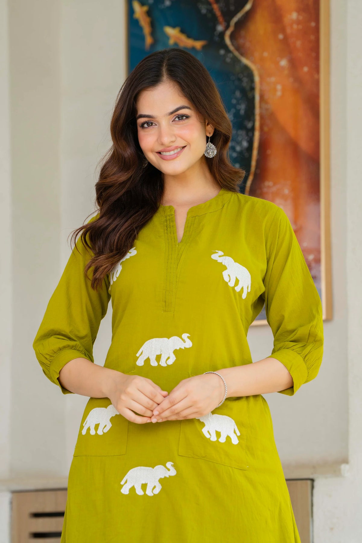 The kurti is made from heavy rayon fabric, known for its soft feel, beautiful drape, and durability. It features exquisite embroidery work that adds a touch of sophistication and charm to the design. The kurti's length is 42+ inches, providing a graceful, flowing silhouette, and the 3/4 sleeves offer a comfortable and stylish fit.