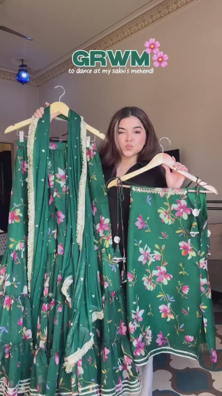 The outfit features a beautifully tailored short top, a flowy ruffle-style sharara, and a delicately embellished dupatta, creating a balanced look of comfort, luxury, and effortless style.